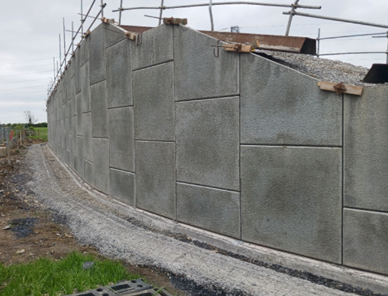 Our large panel system (3.0m * 1.5m) facilitates the casting of masonry stone into the front of the panels. This attractive solution was used on retaining wall no. 3 on the Snugborough upgrade project.